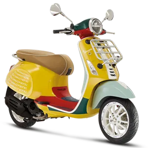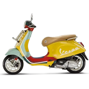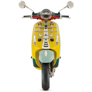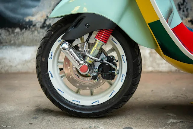 Thân xe được tô điểm bởi những mảng màu sơn vàng, đỏ, xanh lam đậm và xanh ngọc, nhấn nhá các chi tiết sơn màu trắng thời thượng ở cà vạt xe, mào xe, viền thân xe, vành bánh xe cá tính với chuỗi logo của Vespa.