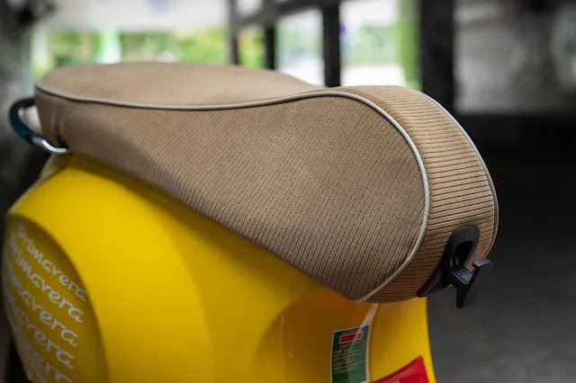 Sean Wotherspoon chọn lựa chất liệu nhung màu nâu nhạt cho yên xe với đường chỉ viền màu trắng đi kèm với logo chữ ký SW thêu nổi trẻ trung. Yên xe bằng nhung là một chi tiết sáng tạo đột phá, tạo ra một phiên bản đặc biệt "độc nhất vô nhị" trong lịch sử xe tay ga.